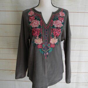 ANDREE BY UNIT GRAY LONG SLV SOFT EMBROIDERED BOHO TOP SZ S