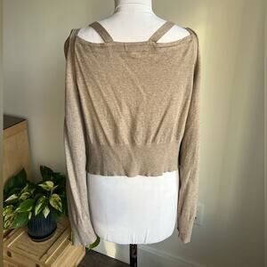 Tan cardigan from Anthropologie Moth brand. A take on the cold shoulder with this strappy shoulder cut out. Also a bit of a puff sleeve with gathered material on top of the shoulder. Size tag missing but would place this as a small based on fit. Soft knit cotton blend.