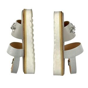 DETAIL: SLING BACK WITH ADJUSTABLE BUCKLE. 1 CROSS STRAPS WITH CRACKLE FINISH PATENT LEATHER. 1 SMOOTH LEATHER STRAP WITH BEADED FLORAL DETAIL. FOAM RIBBED PLATFORM OUTSOLE.