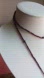 Small red faceted glass beads spaced at intervals with a larger black faceted bead. Black teardrop beads hang from the end of the pendent.