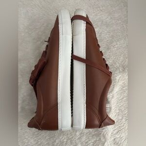 The ASOS DESIGN lace-up sneakers feature a contemporary design in a tan faux leather material, showcasing a smooth texture. They have a classic lace-up front for secure fitting, a cushioned insole for comfort, and a sleek silhouette that makes them versatile for casual outfits. The durable rubber sole provides good traction, making these sneakers both stylish and practical. Perfect for a trendy, laid-back look. (Small bleach stain on one lace - see picture)