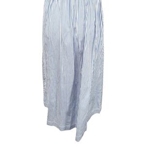 Features: 100% cotton blue and white striped fabric. Short sleeves with rolled detail. Collarless. Button front. Tie waist. Midi Length.