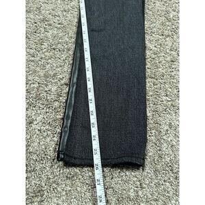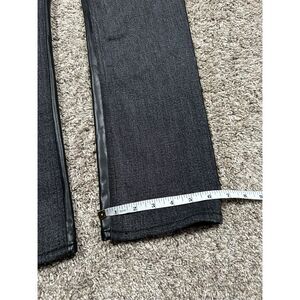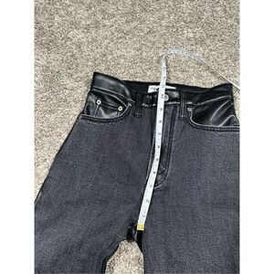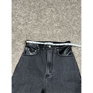 Classic ankle straight jean in black wash with vegan leather waistband, full vegan leather back, and clean hem. Ultra high rise- fitted at waist, hips, and thighs, and eases at the knee into a straight leg shape that hits at an ankle length. Has built in stretch.