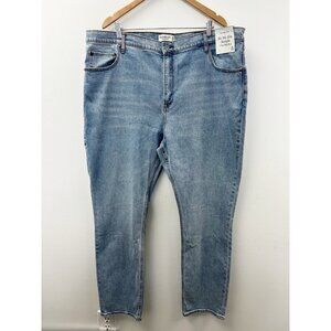 The product is a pair of Abercrombie & Fitch women's 90s slim straight ultra high rise jeans in size 22W. These blue jeans feature a solid pattern, light fabric wash, and are made of a blend of spandex and cotton denim. With high-rise and slim fit, these jeans also have a straight leg style and ankle length. The jeans have a zip and button closure, as well as pockets for added functionality. Perfect for those looking to add a touch of 90s style to their wardrobe with a comfortable and flattering fit.