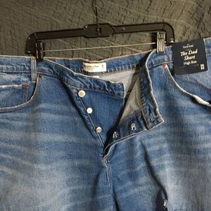 Medium wash high-rise jean shorts. Distressed hem. Front and back pockets.  Size 36/22. It's new with tags. Please refer to pictures for best description and condition verification.