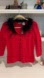 Stylish red cardigan by Acorn. Features unique black feather trim. Ideal for a bold look.