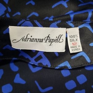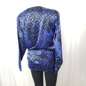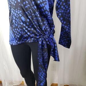 Adrianna Papell 100% silk blue black print long sleeve wrap top with side tie