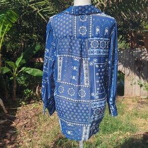Light and flowy top. Open colored v-neck. flower pattern throughout the sheer top blue with white flowers.