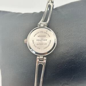 This is an elegant Advance women's quartz watch. It features a sleek silver tone finish and a 20mm case size. The watch is in excellent working condition and has a new battery installed, ensuring it's ready to wear upon arrival.