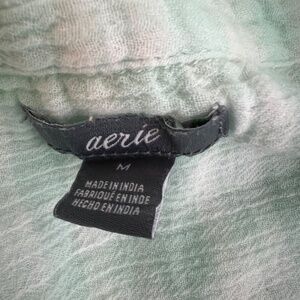 Aerie women's tunic shirt in cool mint green. Collared. V-neck. 1/2 button. Long sleeves. Buttoned cuffs. Chest pockets. Round hem. Gauzy lightweight fabric. In good used condition. No stains, tears or holes.