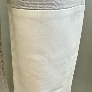 These are vintage-inspired, high-rise jeans with a close-fitting top and an easy straight leg. They’re made with a combination of recycled leather and non-stretch 100% organic cotton denim. Button fly. Gray and white