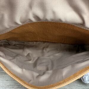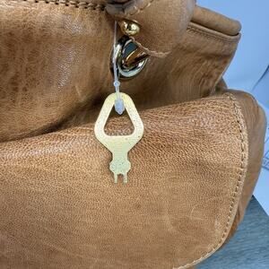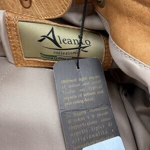 Aleanto Collezioni Italy Camel Leather Satchel Purse Handbag Studded Handle made to look well traveled. The leather is soft. Handle is studded. Front pocket as well as inside zipper pocket. The key to the front pocket is attached. Also comes with the dust bag. There is still paper in the pocket and the tag still on it.