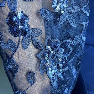 This Alex Evenings maxi gown is gorgeous, with a mesh and sequin upper bodice and sleeves. The waist is gathered in a faux wrap that drapes the gown to the floor and also has a figure flattering effect in the back. 94% polyester, 6% Spandex, spot clean only. Padded bralette and sweetheart neckline complete the effect. 23” slit in skirt  on left side. Retailed for $295. Perfect dress for formal occasions, cocktail party, holiday events, New Years, prom, ball, homecoming, pageant.