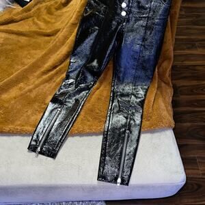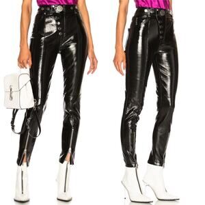 These Alexander Wang Snap-Detailed Patent Leather Skinny Pants are a total showstopper — crafted from genuine high-shine lambskin patent leather with a sleek, sculpted fit. Designed with a high-rise waist, silver-tone hardware, and snap + concealed zip front closure for a bold, edgy finish. Features belt loops, multi-pocket styling, and zippered hems to customize your look. The ultra-sleek silhouette and moto-inspired detailing make these pants the definition of luxury streetwear.