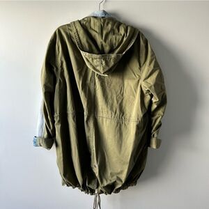 Long sleeve hooded jacket in faded bleach blue denim and army green cotton twill. Spread collar. Button closure at front. Flap pockets at bust. Seam pockets at waist. Buttoned epaulets. Pleats at sleeves. Adjustable buttoned tabs at cuffs. Concealed drawstring at back waist. Asymmetric hem. Drawstring and press-stud fastening at fishtail back hem. Unlined. Black hardware. Tonal stitching.