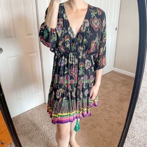 Features: lightweight chiffon fabric, colorful floral print, V neck with button at bust, 3/4 ballon sleeves with elastic cuffs, tired skirt with striped hem, covered elastic waist with drawstring tie