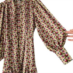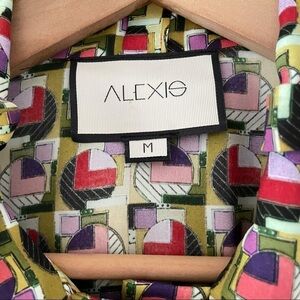Multicolour Mirene geometric-print dress from Alexis featuring a geometric print, belted waist Tied neckline button cuffs ,long sleeves and a short length.