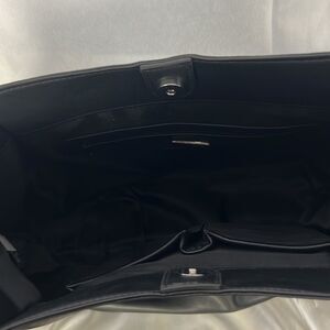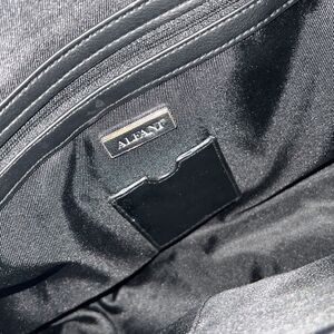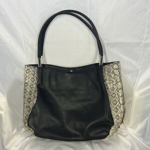 This eye catching Black and snakeskin purse has silver detailing a button close four pockets on the inside and it’s very spacious