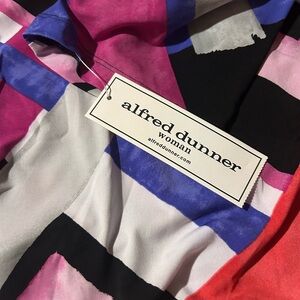 The Alfred Dunner Dunner Asymmetric Women’s Top Tunic in size 3XL is a colorful and geometrically patterned blouse made from polyester fabric. This casual tunic features a round neckline with a carved collar and metal accents, perfect for a relaxed occasion. With 3/4 sleeves and a pullover closure, this lightweight and quick-drying top is easy to care for and suitable for all seasons. The regular fit tunic is designed for plus-size women and adds a touch of style and comfort to any outfit.