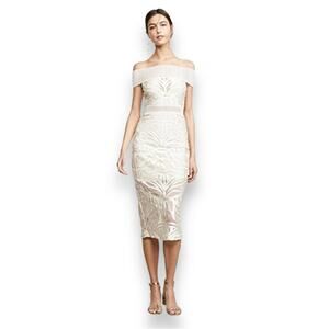 Alice McCall Lunar Eclipse Midi Dress Off Shoulder Mesh Devoré Oatmeal 0 Women’s