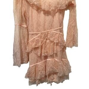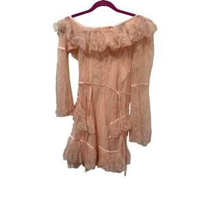 Keywords: Alice McCall lace dress, blush pink ruffle mini, off shoulder designer dress, romantic cocktail dress, sheer long sleeve dress, holiday party outfit, fall wedding guest dress, feminine evening look, size 6, Valentine's day
