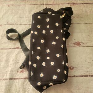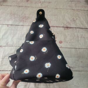 Black canvas duffle with daisy print throughout, silver tone hardwear, dual shoulder straps, one interior zip closure pocket, and top zip closure. In excellent, like new condition.