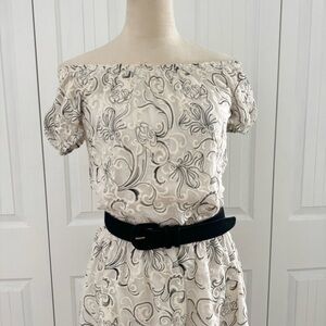 Twisting embroidery adds intriguing texture to a charming off-the-shoulder dress cut with a languid, draping silhouette from fine featherweight silk.