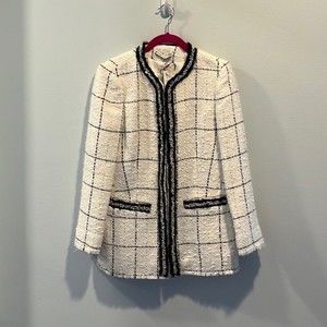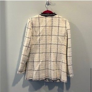 Chic checkered design. Open front style. Black trim accents. Perfect for layering.