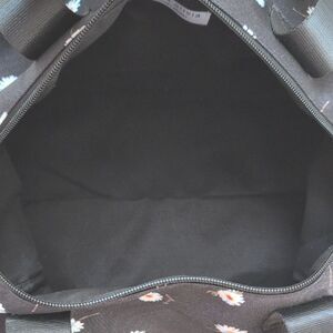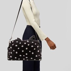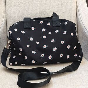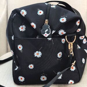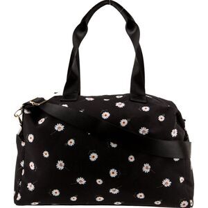 Alice + Olivia by Stacey Bendet Canvas Weekender Duffel Bag in Black with a daisy floral print. This versatile bag features a top zipper closure, exterior side pockets, snaps on the sides to adjust the size, 2 top handles, an adjustable crossbody strap that is detachable, and a black interior lining with 1 zipper pocket.
