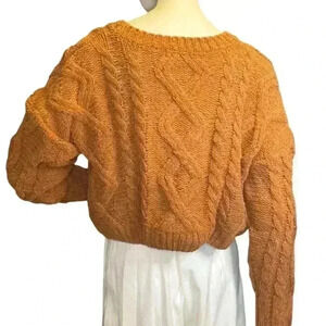 This cozy sweater features a chunky cable knit design dawn the center and is slightly cropped to hit right at the waist in good condition.