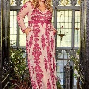 Chic long sleeve dress with burgundy floral patterns. Sheer elegance with a modern touch. Perfect for any event. Approximately 56 inches long.