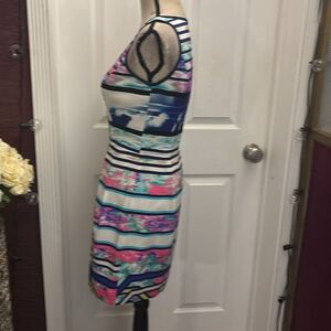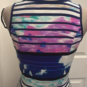 Vibrant sleeveless dress with bold stripes. Features a mix of colors for a striking look. Perfect for casual outings. New, no tags