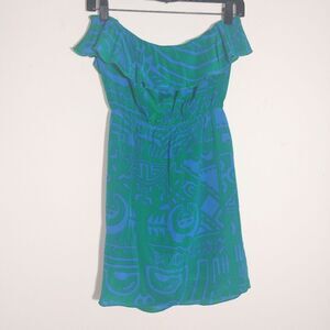 A teal-blue, off-the-shoulder dress with a vibrant geometric pattern. The dress has a ruffled, off-the-shoulder neckline, and has a gathered effect around the waist. The pattern is a bold, graphic design of swirling lines and shapes in shades of green and turquoise teal blue