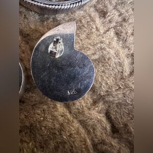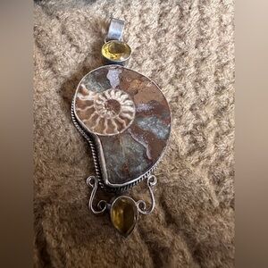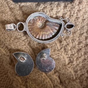 This exquisite jewelry set features a fossil ammonite pendant with stunning citrine accents, and matching ammonite stud earrings. All set in sterling silver. The earthy tones of the ammonite are beautifully complemented by the silver setting, making it a unique addition to any collection.