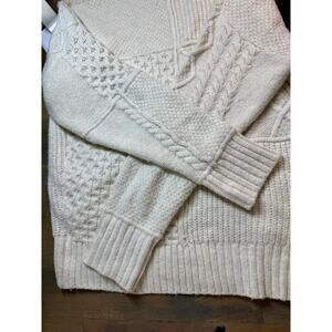 The unique patchwork knit design adds a touch of individuality to the creamy winter white hue. Designed to be oversized, it offers a comfortable and relaxed fit. For reference, the model in the picture wears a size 4 in tops.
