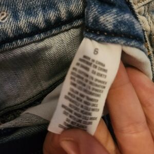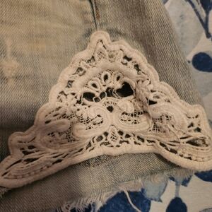 Stylish denim shorts with lace trim, perfect for casual outings. Features a classic blue color for versatile styling. size 6. 2" inseam. 17" waist