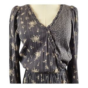 A chocolate brown crinkled fabric dress, sprinkled with small tan floral bouquets accented with ruffles and a peplum with a busier pattern tiny tan flowers. The left side of the bodice has a coordinating pattern with the peplum.