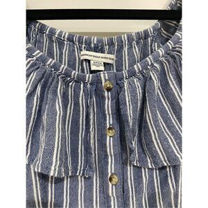 American Eagle woven and ruffled off the shoulder blue and white striped dress. Button up closure. Very lightweight and breezy, perfect for summer! Comes from smoke free home
