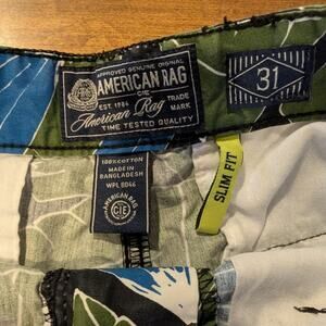 Dive into style with American Rag's board shorts, showcasing a bold blue and green tropical print. Crafted for comfort and flair, these swim essentials are perfect for your next beach getaway.