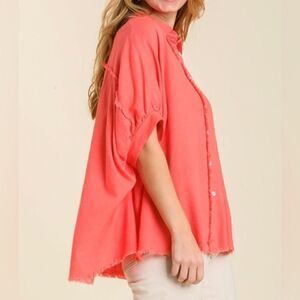 NWT. Angee Oversized Collared Blouse in Coral, size S. Modern women's shirt featuring collared design and distressed details. Linen Blend Button Down Top with Frayed Placket No Lining. 55% linen, 45% rayon.