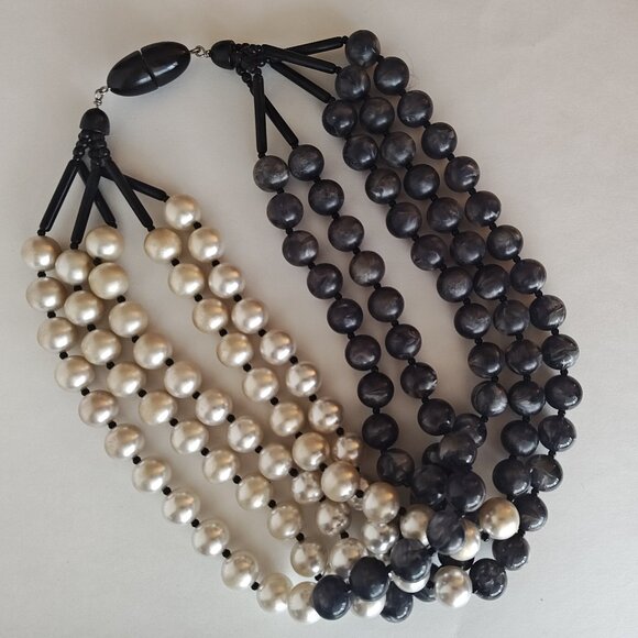 Black and white acrylic 4 strand necklace, beads are pearlized / marbleized in appearance. Black clasp is magnetic. Overall length is 21", includes original bag.