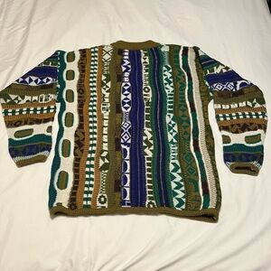 Vintage crewneck Angenie 70% acrylic 30% wool sweater. Sweater is shades of green, brown, blue, and white and has a "Coogi" style pattern. Measures 20 inches pit to pit and 27 inches long. Flaws are small white thread pull, some wear in underarms, small hole in underarm, all shown in photos.