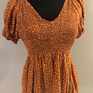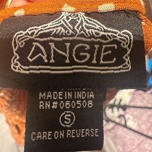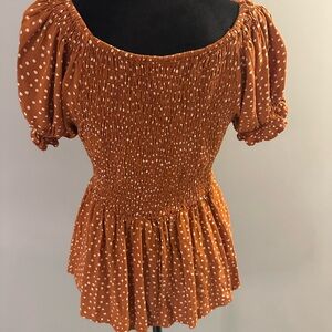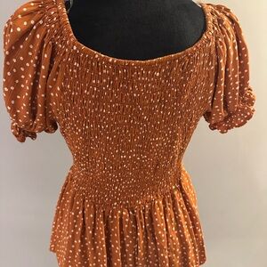 Stylish Angie top in vibrant orange with white dots. Perfect for any occasion.