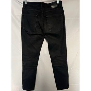 These Anine Bing jeans feature a sleek, modern design with a skinny fit silhouette in a solid black color. Crafted from high-quality denim, they offer a uniform dark wash that exudes sophistication and style.rise 10.5” inseam 25”