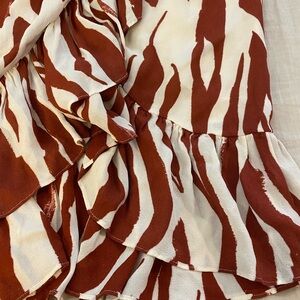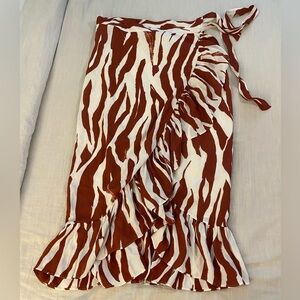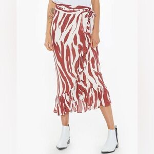 Zebra print detailing adds edge to this wrap midi skirt. Ruffle hem. Self-tie wrap closure. Lined. In red/white.