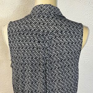 Keywords: Ann Taylor LOFT, sleeveless blouse, geometric print, collared top, black and white blouse, women's top, casual blouse, work blouse, career wear, size M, polyester blouse, summer top, lightweight blouse, dressy casual, button down blouse