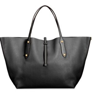 Elegant black leather tote with sleek design. Features gold hardware. Ideal for versatile use.