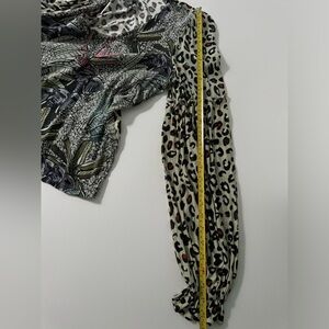 Beautiful unique jungle leaves and elephant print blouse. Cheetah print on sleeves and back. Flowy sleeves with a ruffled trim mid sleeve as well as an elastic ruffled wrist detail.