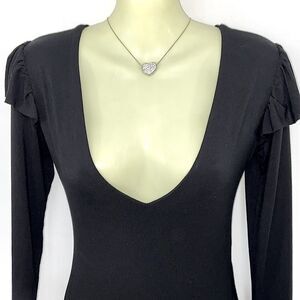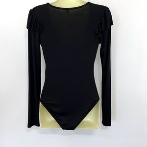 FROM “OUT FROM UNDER” FOR ANTHROPOLOGIE HERE IS A FABULOUS BODY SUIT FOR ALL YEAR LONG. IT IS BLACK, SUPER SOFT AND DONE IN COTTON AND SPANDEX WITH PLENTY OF STRETCH. IT FEATURES A SCOOP NECK AND LONG SLEEVES WITH A RUFFLE ON EACH SHOULDER. GREAT WITH PANTS ORA SKIRT. THERE ARE TWO SNAPS FOR CLOSURE AT THE BOTTOM. NEW WITHOUT TAGS. SIZE MEDIUM, PLEASE NOTE THE MEASUREMENTS AND IT DOES HAVE STRETCH