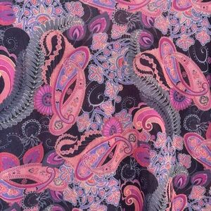 Multicolor floral and paisley print in shades of pink, purple and gray on black background